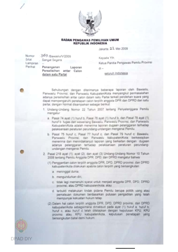 Surat masuk No. 369/Bawaslu/V/2009 dari Badan Pengawas Pemilihan Umum RI perihal penanganan laporan perselisihan antar calon dalam satu partai.