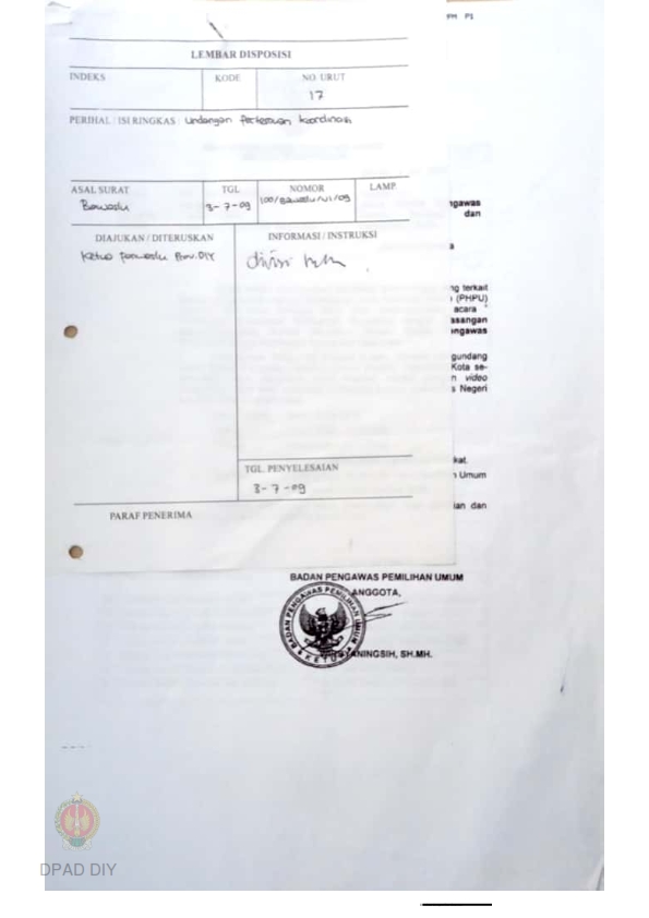 Undangan dari Badan Pengawas Pemilihan Umum RI dalam rangka penanganan perselisihan hasil Pemilihan Umum Presiden dan Wakil Presiden 2009.