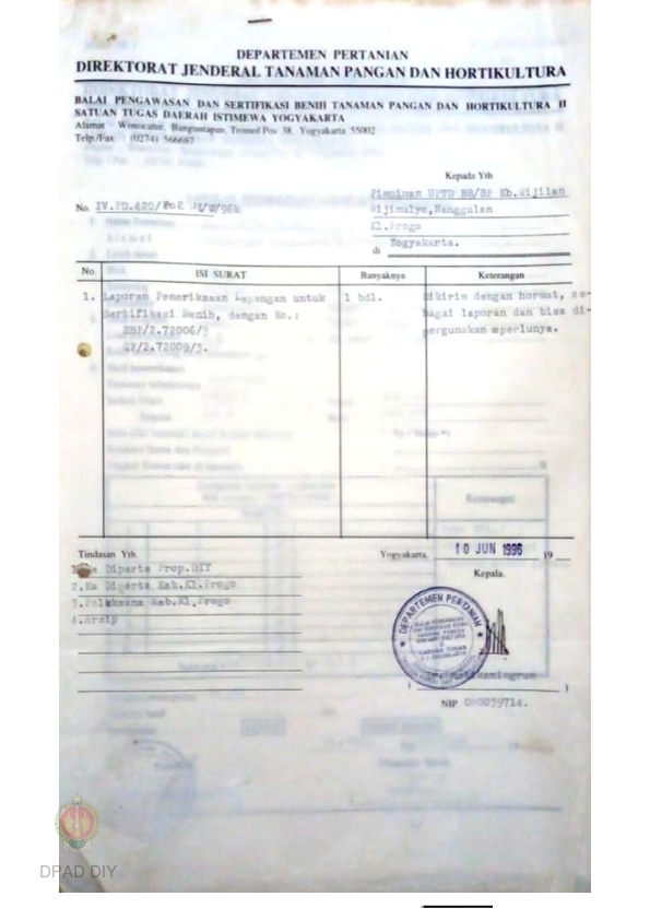 Laporan Hasil pemeriksaan lapangan fase berbunga BPSB II Jateng dan DIY jenis tanaman padi Varitas IR 64 bulan Juni 1996 di desa Wijimulyo