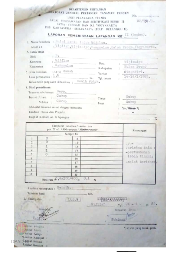 Laporan hasil pemeriksaan lapangan ke II BPSB II Jateng dan DIY jenis tanaman padi sawah Varitas Cimandiri di desa Wijimulyo Nanggulan Kulonprogo bulan April 1982