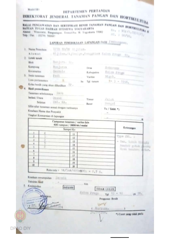 Laporan hasil pemeriksaan lapangan fase pembungaan BPSB II Jateng dan DIY jenis tanaman padi sawah Varitas Citandung bulan Juli 1988 di desa Wijimulyo Nanggulan Kulonprogo