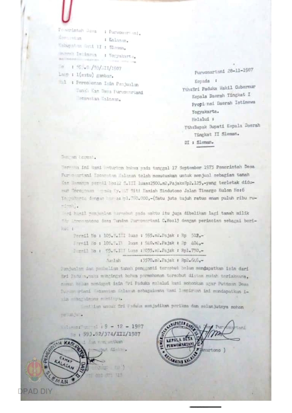 Surat Kepala Desa Purwomartani kepada Sri Paduka Wakil Gubernur Kepala Daerah Tingkat I melalui Bupati Kepala Daerah Tingkat II Sleman tentang permohonan izin penjualan tanah kas Desa Purwomartani Kec. Kalasan Kab. Sleman.