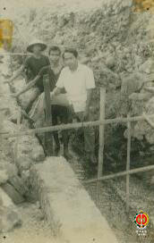 Tampak tiga orang sedang berpose di antara bangunan yang sudah dalam kondisi 50%.