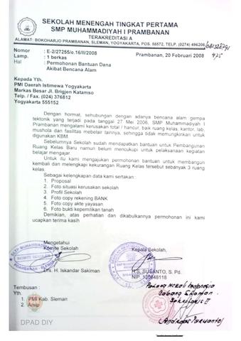 Tanggal 20 Februari 2008 proposal permohonan dana pembangunan kembali gedung SMP Muhammadiyah I Prambanan akibat bencana gempa tektonik.